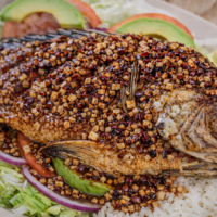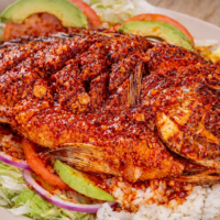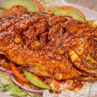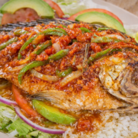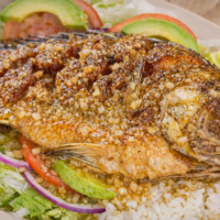 Grilled salmon sauteed with a spicy, Nayarit-style sauce.