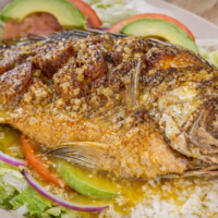 Deep-fied, red snapper. Served with crab salad, green salad, and white rice.