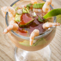 Shrimp cocktail prepared with cilantro, onion, tomato, and avocado.