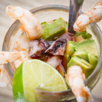 Octopus, cooked shrimp, surimi, onion, and cucumber in a special clamato juice.