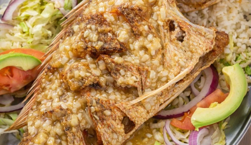 Huachinango al Mojo de Ajo November 28, 2023By admin Acompañado con ensalada de jaiba, ensalada verde y arroz blanco. Deep-fried, red snapper bathed with a garlic sauce. Served with crab salad, green salad, and white rice. Post navigation Prev postPrev post:Next postNext post: