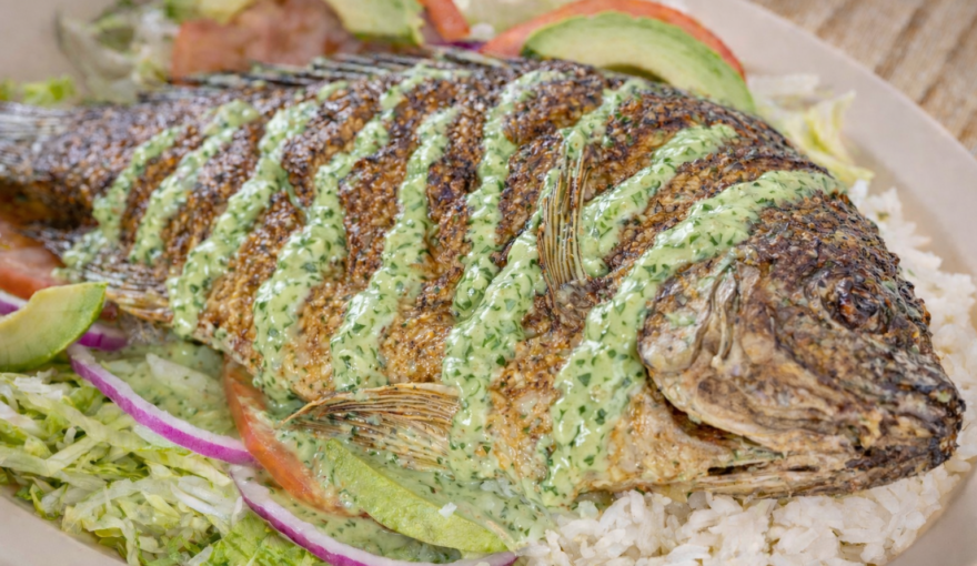 Mojarra al Cilantro September 21, 2023By admin Acompañada con ensalada de jaiba, ensalada verde h arroz blanco. Red snapper bathed in a creamy cilantro sauce. Served with crab salad, green salad, and white rice. Post navigation Prev postPrev post:Next postNext post: