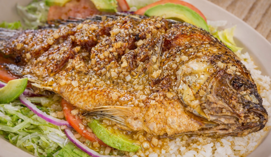 Mojarra al Mojo de Ajo September 21, 2023By admin Acompañada con ensalada de jaiba, ensalada verde y arroz blanco. A deep-fried whole tilapia, bathed with a garlic sauce. Served with crab salad, green salad, and white rice. Post navigation Prev postPrev post:Next postNext post: