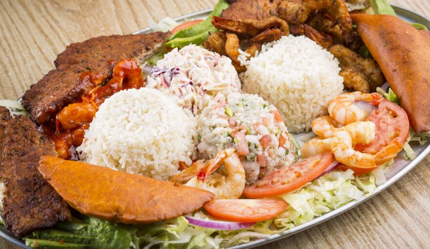 Breaded shrimp, “a la diabla” shrimp, buttered shrimp, garlic shrimp, and (2) shrimp empanadas. Served with the following sides: fish ceviche, crab salad, green salad, and white rice.